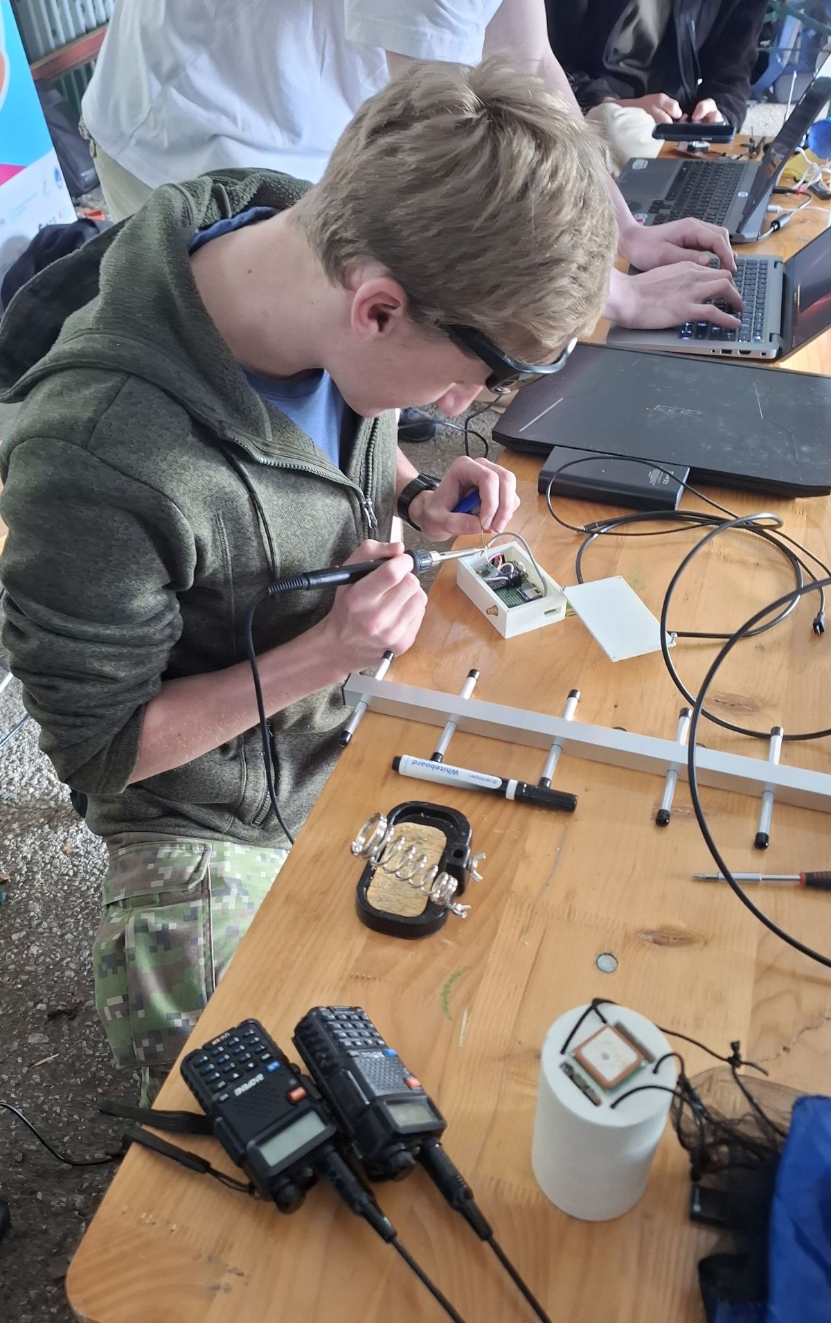 Po privítaní koordinátorom pre východoslovenský kraj Ing. Patrikom Švábom, PhD., z Leteckej fakulty TUKE a prevzatí si „štartovacieho“ balíčka s občerstvením sme sa pustili do prichystania sondy na prevádzku. Tím sa pustil do prípravy stanovištia, Michal pripojil batériu a otestoval rádiovú komunikáciu s modulom a druháci spustili počítače a testovali príjem a spracovanie dát zo sondy. Eva ako PR manažérka všetko sledovala, robila fotky a zaznamenávala správnosť postupov. Všetko prebiehalo v poriadku, dáta prichádzali, vládla spokojnosť. Mali sme aj čas sledovať prácu ostatných tímov, na neformálne rozhovory s hosťami, ale aj vážne rozhovory s redaktormi z televízie.