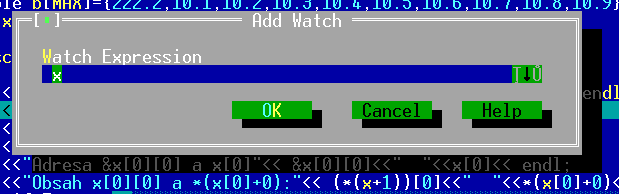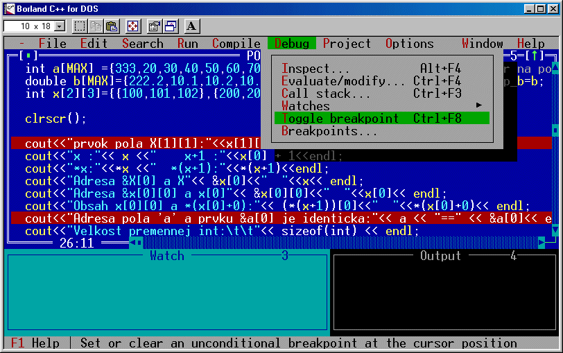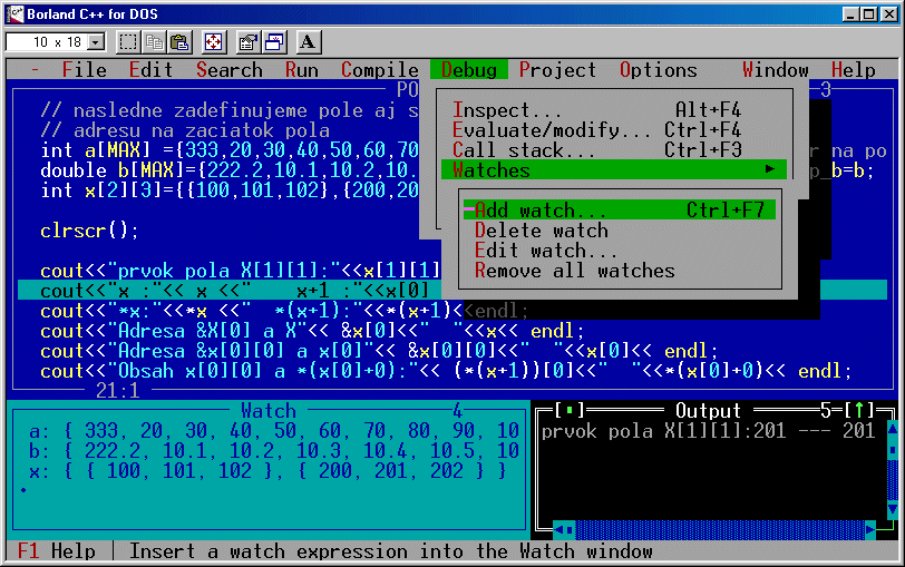 ktoré žiada, aby ste udali názov premennej, alebo výraz používajúci premennú, ktorého obsah chcete sledovať. V prípade že ste kurzor správne umiestnili názov premennej uvidíte vpísaný do údajového poľa a stačí potvrdiť OK. V tej chvíli sa názov premennej objaví v okne Watch. Urobte to pre všetky pemenné, ktoré chcete sledovať a môžete začať Ladenie. Postup krokovania programu pri ladení.Na ladenie programu najlepšie poslúži metóda krokovania programu. V tomto režime sa program vykonáva po riadkoch, tak ako je zapísaný v zdrojovom texte. Ak na jednom riadku máte súčasne viac príkazov, všetky sa vykonajú v jednom kroku. Ak tieto príkazy chcete vykonať postupne, umiestnite kažý na samostatný riadok.