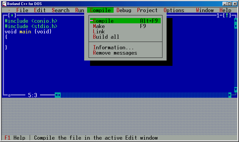 Pri pogramovaní často potrebujete pomoc, na to slúži integrovaný Help ktorý vyvoláte buď cez MENU alebo použitím F1 resp. 2 x stlačíte F1. Ak potrebujete pomoc so syntaxou príkazov jazyka C, využite schopnosť kontextového Help-u. Rrobíte to takto: Napíšte do zdrojového textu identifikátor prvku jazyka ktorý hľadáte (trénujte pamäť), postavte kurzor pod dané slovo a vyvolajte Help príkazom Ctrl + F1. Zobrazí sa okno s popisom prvku. Na jeho konci zvyčajne nájdete zoznam podobných resp. súvisiacich prvkov s tým, ktorý ste do textu napísali. Úplne na konci býva odkaz na vzorový príklad v ktorom je daný prvok použitý. Okná Help-u v sebe obsahuje žltou farbou zvýraznené kľúčové slová. Ich poklepaním sa vnoríte do ďaľších stránok Helpu, ktoré tému ďalej doplňujú. Takto vyzbrojený môžete začať. Pomocou File / New otvoríte pracovné okno a doň vpíšte nasledovný program: |