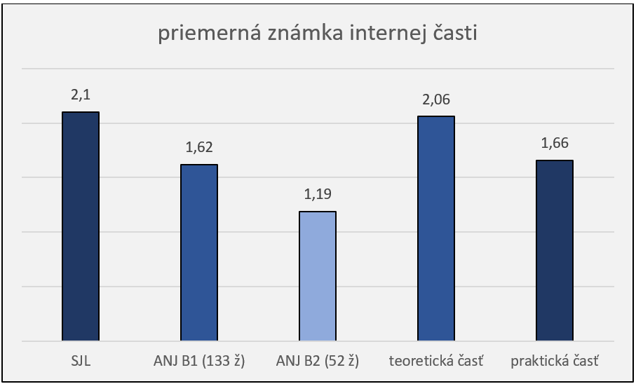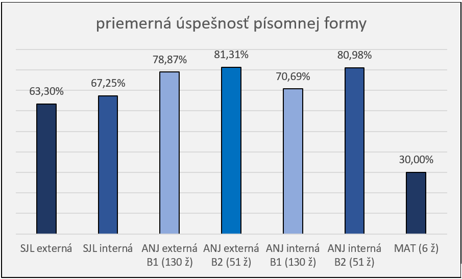 - Anglický jazyk – úroveň B2: priemerná známka 1,19 a úspešnosť v externej časti na úrovni 81,31 %