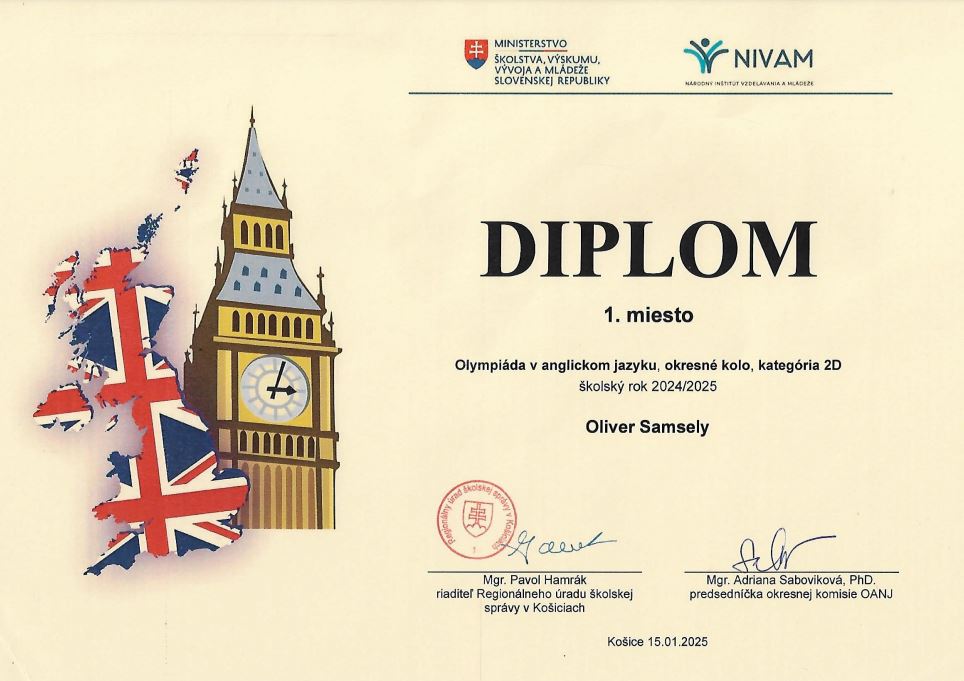 Veľmi nás teší, že náš žiak Oliver Samsely, zo 4.B, dosiahol vynikajúce 1. miesto v okresnom kole Olympiády v anglickom jazyku.