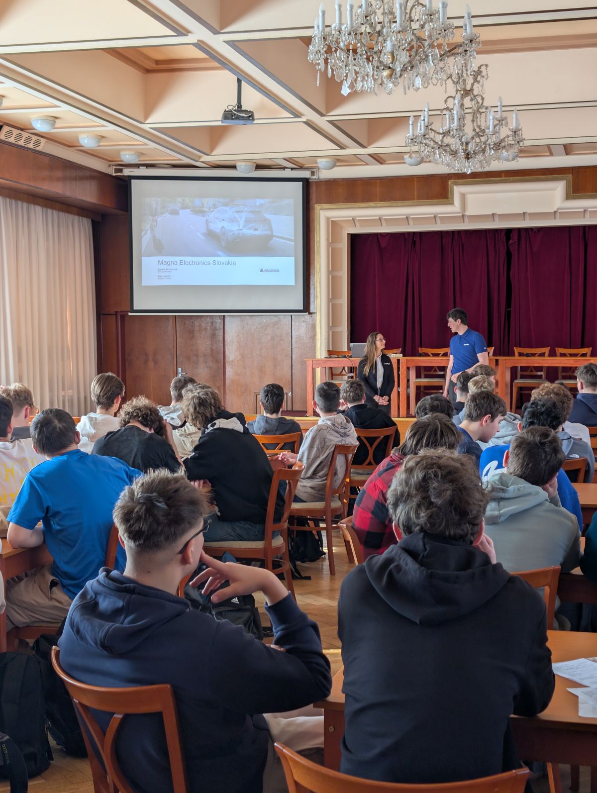 V piatok 27. 2. 2026 sa na pôde našej školy predstavila spoločnosť Magna Electronics Slovakia, ktorá sídli v Kechneci. Je piatym podnikom na výrobu elektroniky patriacim pod celosvetovo pôsobiacu kanadskú spoločnosť Magna International zameriavajúcu sa na oblasť automobilového priemyslu. Produktová skupina Magna Electronics sa zaoberá vývojom a výrobou špičkových riešení pre autonómne riadenie vozidiel a ich elektrifikáciu.