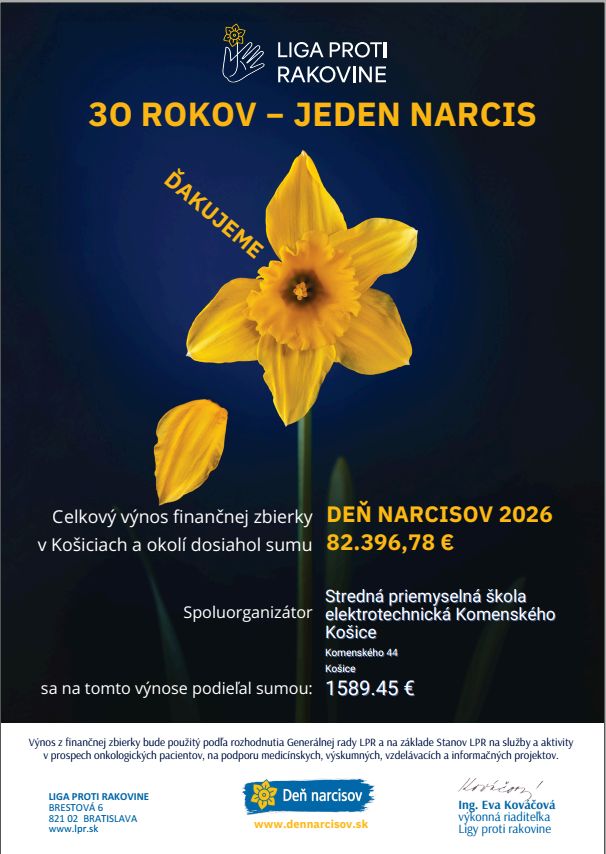 Naša škola sa 16. 4. 2026 zapojila do celoslovenskej zbierky Deň narcisov, ktorú organizuje Liga proti rakovine. Tento rok bol výnimočný – konal sa už jej 30. ročník.