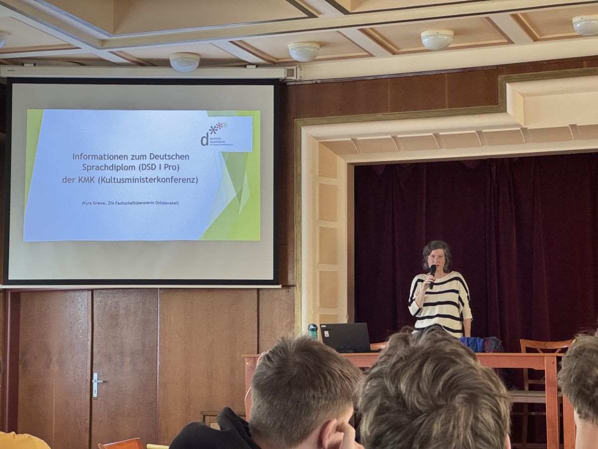 Dňa 24. apríla navštívila našu školu odborná poradkyňa pani Kyra Grewe, aby žiakom predstavila medzinárodnú jazykovú skúšku DSD I PRO. Podujatie bolo určené pre všetkých nemčinárov, ktorí zvažujú zapojiť sa a preveriť si svoje jazykové schopnosti.