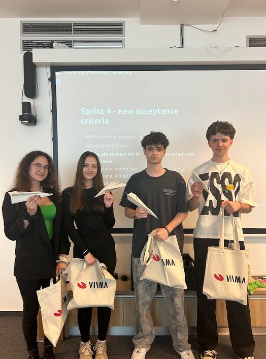 Študenti si tiež vyskúšali princípy agilného riadenia projektov, konkrétne metodiku Scrum. V tímoch mali za úlohu postaviť čo najviac papierových lietadiel za 3 minúty, pričom museli dodržať presné pravidlá. Aktivita ukázala, aký význam má spolupráca, komunikácia, rozdelenie rolí aj efektívne plánovanie – presne tie zručnosti, ktoré firmy v praxi očakávajú.