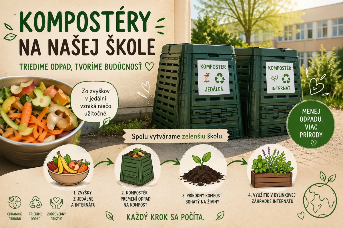 Naša škola opäť urobila krok smerom k udržateľnosti a zodpovednému prístupu k životnému prostrediu. V apríli pribudli pri školskej jedálni nové kompostéry, ktoré prinášajú praktické riešenie pre triedenie bioodpadu priamo v našom každodennom školskom živote.